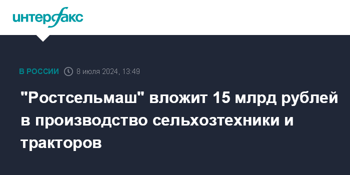 Москва. 8 июля. INTERFAX.RU - "Ростсельмаш", один из крупнейших в России производителей сельхозмашин, планирует инвестировать в развитие производства сельхозтехники и тракторов порядка 15 млрд рублей, сообщает сайт правительства Ростовской области.