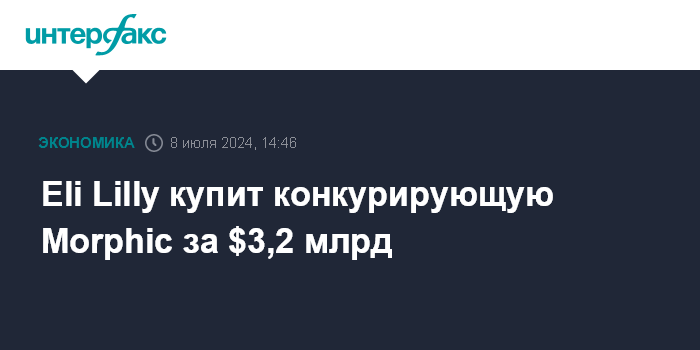 Москва. 8 июля. INTERFAX.RU - Американская фармкомпания Eli Lilly договорилась о покупке разработчика биофармацевтических препаратов от тяжелых хронических заболеваний Morphic Holding примерно за $3,2 млрд, говорится в совместном пресс-релизе компаний.