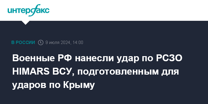 Москва. 9 июля. INTERFAX.RU - Вооружённые силы России в течение суток нанесли групповой удар по РСЗО HIMARS украинской армии, подготовленным для ударов по Крыму, уничтожено четыре установки, до 35 иностранных специалистов, сообщило министерство обороны РФ во вторник.
