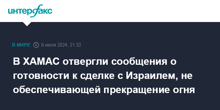 Москва. 9 июля. INTERFAX.RU - В ХАМАС назвали неверными сообщения о том, что они согласны на сделку с Израилем по заложникам, которая не обеспечит "всеобъемлющего прекращения огня". Об этом сообщает телеканал Al Arabiya со ссылкой на это палестинское движение.