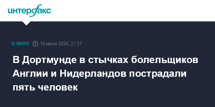 Москва. 10 июля. INTERFAX.RU - В Дортмунде в преддверии полуфинального матча Чемпионата Европы по футболу произошли стычки между болельщиками сборных Англии и Нидерландов, пять человек получили травмы, передает АР со ссылкой на британское полицейское подразделение, которое занимается инцидентами с участием британских фанатов.