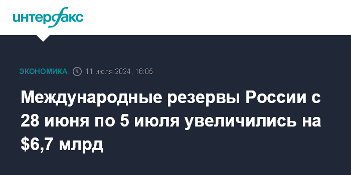 Международные резервы России с 28 июня по 5 июля увеличились на $6,7 млрд