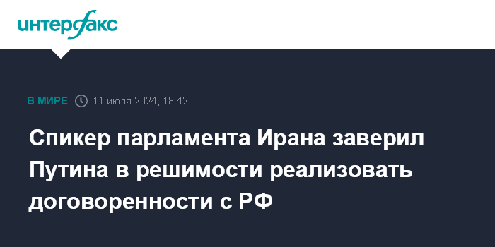 Спикер парламента Ирана заверил Путина в решимости реализовать договоренности с РФ