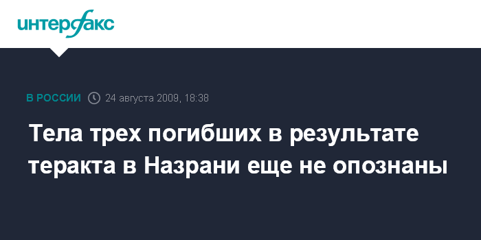 Назрань. 24 августа. INTERFAX.RU - Из числа погибших в результате взрыва у здания ГУВД в Назрани трое остаются неопознанными, сообщили агентству "Интерфакс-Юг" в понедельник в пресс-службе МВД Ингушетии.