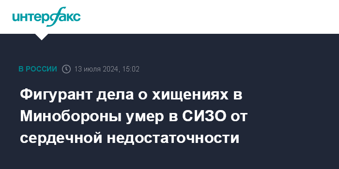 Фигурант дела о хищениях в Минобороны умер в СИЗО от сердечной недостаточности