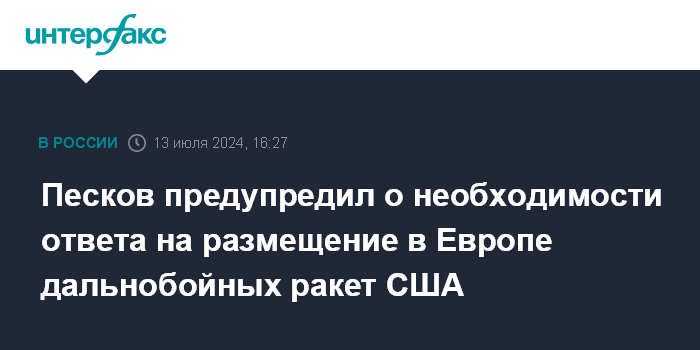 Песков предупредил о необходимости ответа на размещение в Европе дальнобойных ракет США