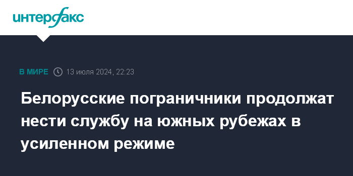 Москва. 13 июля. INTERFAX.RU - Белорусские пограничники продолжат нести службу на границе с Украиной в усиленном режиме, сообщил журналистам председатель Государственного пограничного комитета Константин Молостов по итогам совещания у президента Александра Лукашенко по вопросам обеспечения военной безопасности страны на южном операционном направлении.