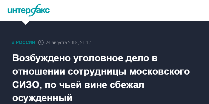 Москва. 24 августа. INTERFAX.RU - Следственным подразделением Следственного управления СКП РФ по г. Москве завершена доследственная проверка по факту побега осужденного из следственного изолятора, сообщил руководитель СУ СКП РФ по г. Москве Анатолий Багмет.