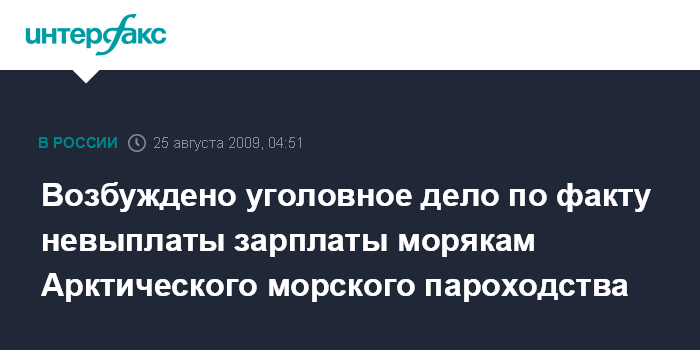 Владивосток. 25 августа. ИНТЕРФАКС - ДАЛЬНИЙ ВОСТОК - Уголовное дело возбуждено по факту невыплаты заработной платы работникам ОАО "Судоходная компания "Арктическое морское пароходство" (АМП), в том числе экипажам двух судов, задержанных за долги судовладельца в Китае.