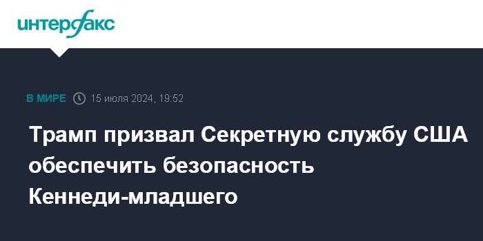 "В свете того, что происходит сегодня в мире, я считаю необходимым, чтобы Роберт Кеннеди немедленно получил защиту Секретной службы. Учитывая историю семьи Кеннеди, это было бы очевидно правильным решением", - написал Трамп в соцсети Truth Social.