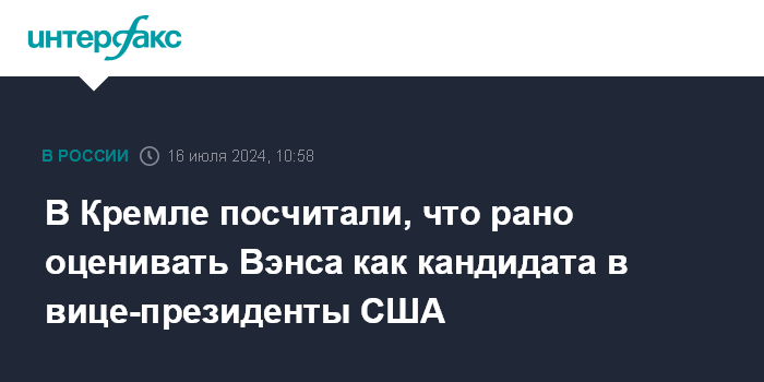 Москва. 16 июля. INTERFAX.RU - Давать оценки кандидатуре на пост вице-президента США Джей Ди Вэнса пока преждевременно, заявил пресс-секретарь президента РФ Дмитрий Песков.