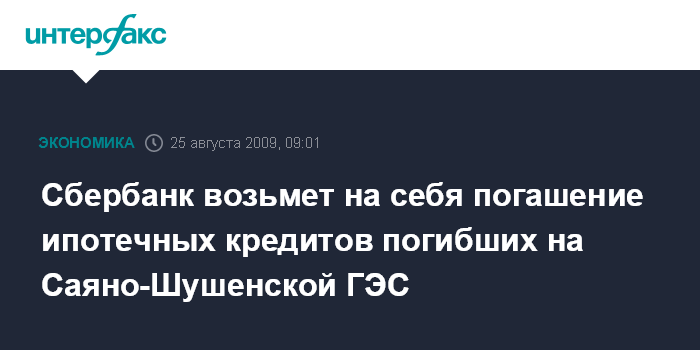 Сбербанк возьмет на себя погашение ипотечных кредитов погибших на Саяно-Шушенской ГЭС