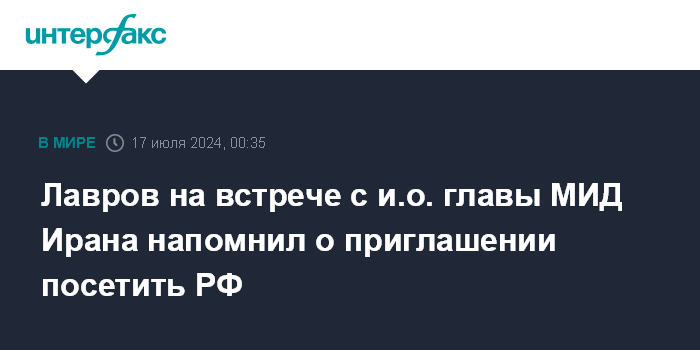 Москва. 17 июля. INTERFAX.RU - Глава МИД РФ Сергей Лавров напомнил исполняющему обязанности главы МИД Ирана Али Багери Кяни о своем приглашении посетить Россию.