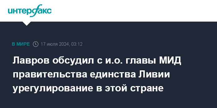 Москва. 17 июля. INTERFAX.RU - Глава МИД РФ Сергей Лавров обсудил с и. о. главы МИД, базирующегося в Триполи, Правительства национального единства Ливии Тахером аль-Бауром ливийское урегулирование.