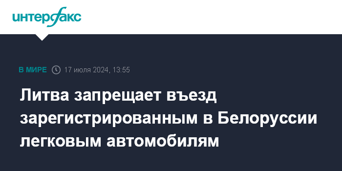Москва. 17 июля. INTERFAX.RU - Литва с четверга, 18 июля запрещает въезд зарегистрированным в Белоруссии легковым автомобилям, сообщила в среду пресс-служба литовской таможни.