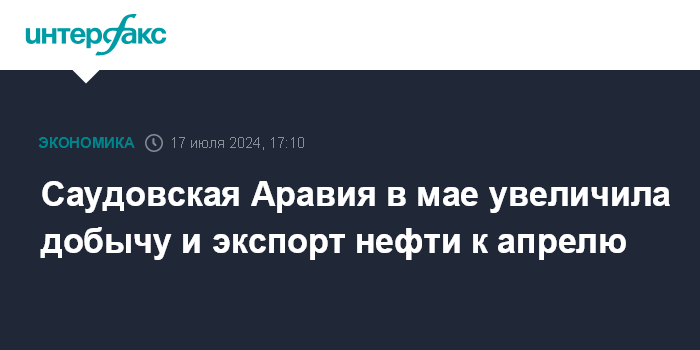Москва. 17 июля. INTERFAX.RU - Саудовская Аравия в мае увеличила добычу нефти на 0,1% относительно апреля, экспорт нефти - на 2,5%, сообщает сайт Joint Organization Data Initiative (JODI).