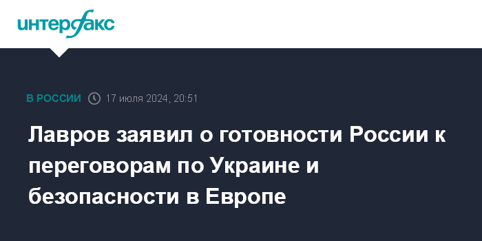 Москва. 17 июля. INTERFAX.RU - Москва готова к переговорам по Украине и безопасности в Европе с учетом необходимости обеспечения собственных интересов, заявил на пресс-конференции в Нью-Йорке глава МИД России Сергей Лавров.