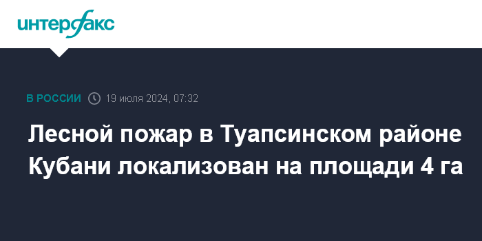 Москва. 19 июля. INTERFAX.RU - Пожарные локализовали возгорание в Туапсинском лесничестве на площади 4 га, сообщает министерство природных ресурсов Краснодарского края в пятницу в своем телеграм-канале.
