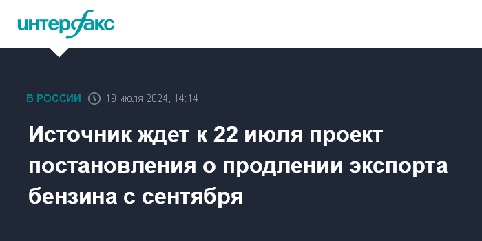 Источник ждет к 22 июля проект постановления о продлении экспорта бензина с сентября