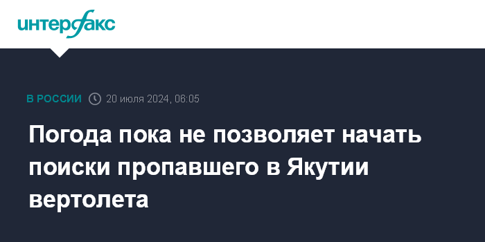 Москва. 20 июля. INTERFAX.RU - Погодные условия пока не позволяют задействовать воздушное судно в поисках вертолета Robinson, пропавшего в Якутии, сообщили "Интерфаксу" в пресс-службе авиакомпании "Полярные авиалинии" в субботу.
