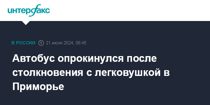 Москва. 21 июля. INTERFAX.RU - Рейсовый автобус, следовавший по направлению Фокино - Большой Камень в Приморье, опрокинулся после столкновения с легковым автомобилем, пострадали три человека, сообщает региональный главк МВД.