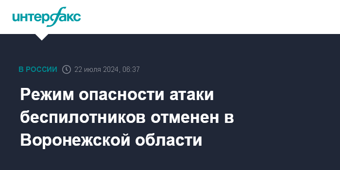 Москва. 22 июля. INTERFAX.RU - На территории Воронежской области отменен режим опасности атаки беспилотников, сообщил глава региона Александр Гусев.
