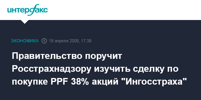 Москва. 18 апреля. ИНТЕРФАКС-АФИ - Правительство РФ планирует направить в Федеральную службу страхового надзора поручение изучить детали сделки по покупке PPF Investments 38,4% акций ОСАО "Ингосстрах", сообщил "Интерфаксу" источник в кабинете министров.