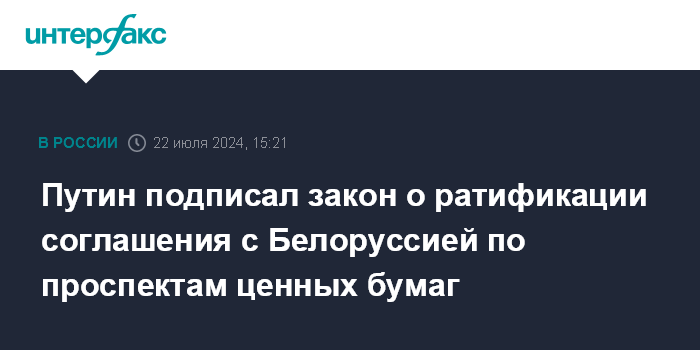 Москва. 22 июля. INTERFAX.RU - Президент РФ Владимир Путин подписал закон о ратификации соглашения с Белоруссией о признании проспектов ценных бумаг, зарегистрированных на территории одной стороны, для размещения на территории другой. Об этом сообщается на официальном портале опубликования нормативных правовых актов.