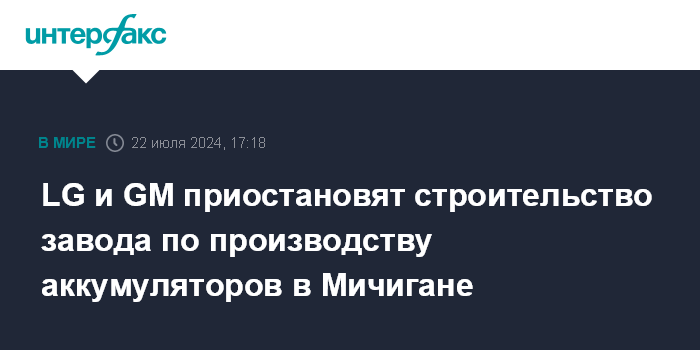 Москва. 22 июля. INTERFAX.RU - Ultium Cells, совместное предприятие американского автомобильного концерна General Motors и южнокорейской LG Energy Solution, приостановило строительства завода по производству аккумуляторных батарей для электромобилей в штате Мичиган.