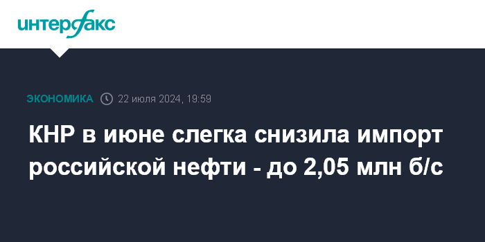 КНР в июне слегка снизила импорт российской нефти - до 2,05 млн б/с