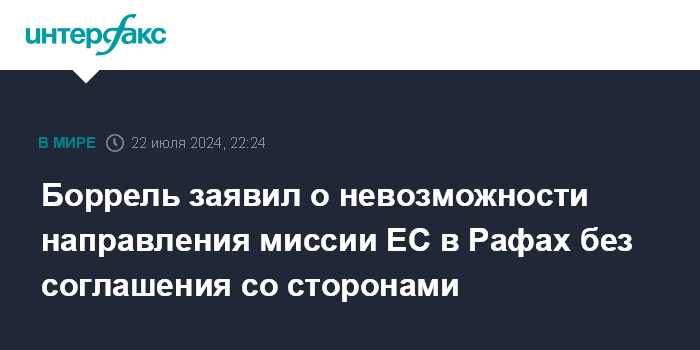 Москва. 22 июля. INTERFAX.RU - ЕС готов развернуть пограничную миссию Евросоюза EUBAM Рафах для сектора Газа, но не может этого сделать без соглашения со сторонами, заявил глава европейской дипломатии Жозеп Боррель.
