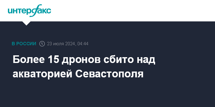 Москва. 23 июля. INTERFAX.RU - Губернатор Севастополя Михаил Развожаев сообщил в ночь на вторник об уничтожении более 15 беспилотников над акваторией города.