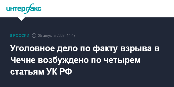 Москва. 25 августа. INTERFAX.RU - По факту взрыва в Шалинском районе Чечни возбуждено уголовное дело по четырем статьям УК РФ, сообщил "Интерфаксу" во вторник официальный представитель СКП РФ Владимир Маркин.