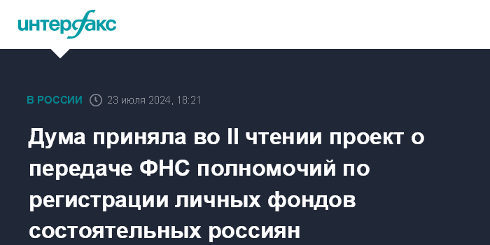 Москва. 23 июля. INTERFAX.RU - Госдума приняла во втором чтении законопроект о передаче Федеральной налоговой службе (ФНС) полномочий по регистрации личных фондов россиян - аналогов зарубежных трастов.