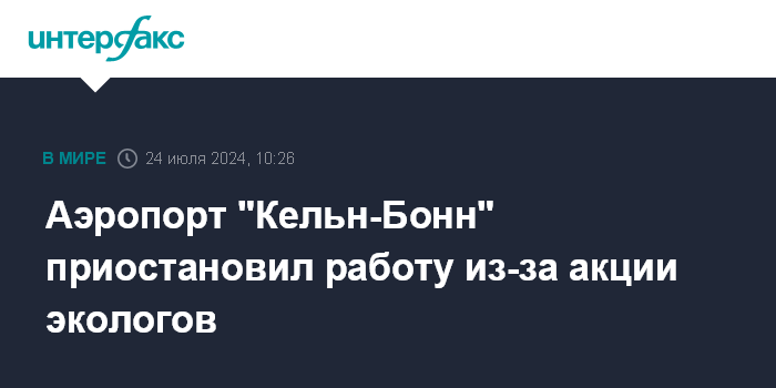 Москва. 24 июля. INTERFAX.RU - Активисты из экологической группировки "Последнее поколение" в среду прорвались на взлетно-посадочную полосу аэропорта "Кельн-Бонн" в Германии, после чего он приостановил отправку и прием рейсов.