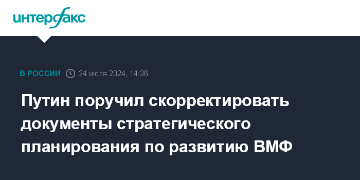 Москва. 24 июля. INTERFAX.RU - Президент России Владимир Путин после совещания по кораблестроению поручил скорректировать стратегические документы по развитию Военно-морского флота (ВМФ), заявил журналистам его помощник Николай Патрушев.