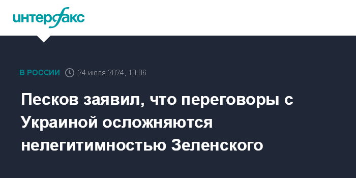 Москва. 24 июля. INTERFAX.RU - Нелегитимность Владимира Зеленского является проблемой, так же как и указ о недопустимости переговоров с Москвой, это может осложнять переговорный процесс по урегулированию на Украине, заявил пресс-секретарь президента РФ Дмитрий Песков, выступая на встрече с выпускниками Высшей школы РАНХиГС.