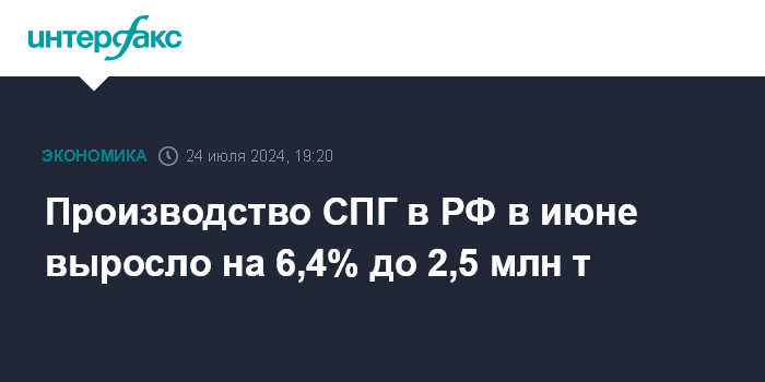 Москва. 24 июля. INTERFAX.RU - Производство крупнотоннажного сжиженного природного газа в России в июне 2024 года выросло по сравнению с прошлогодним показателем на 6,4% до 2,5 млн тонн, сообщил Росстат. Статистическое ведомство округляет данные до одного знака после запятой.