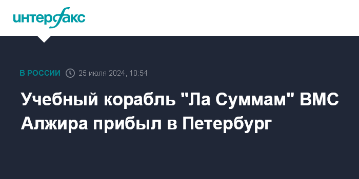 Москва. 25 июля. INTERFAX.RU - Учебный корабль "Ла Суммам" Военно-морских сил Алжира прибыл в Петербург, сообщается в телеграм-канале городского комитета по внешним связям.