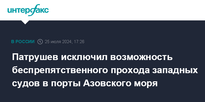 Москва. 25 июля. INTERFAX.RU - Страны Запада не смогут беспрепятственно пройти к азовским портам, заявил помощник президента РФ Николай Патрушев.
