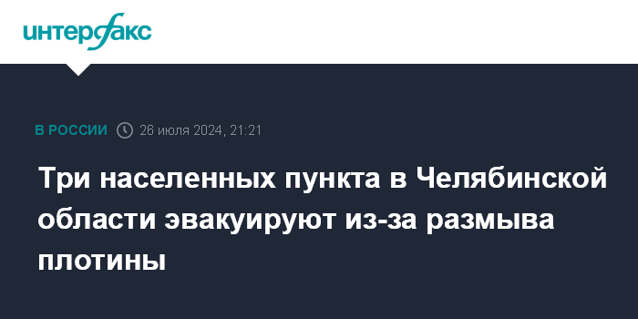Москва. 26 июля. INTERFAX.RU - Три населенных пункта в Челябинской области будут превентивно эвакуированы из-за размыва плотины на Киалимском водохранилище, сообщает в пятницу вечером пресс-служба полномочного представителя президента РФ в УрФО.