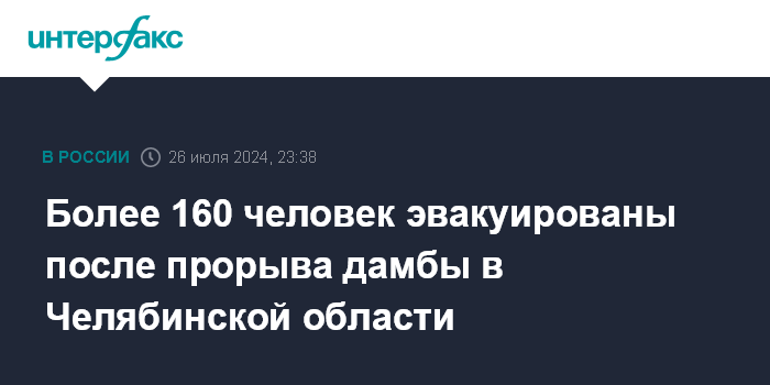 Москва. 26 июля. INTERFAX.RU - Сотрудники МЧС эвакуировали после прорыва дамбы в Челябинской области 163 человека, среди них 21 ребенок, сообщила пресс-служба министерства в пятницу.