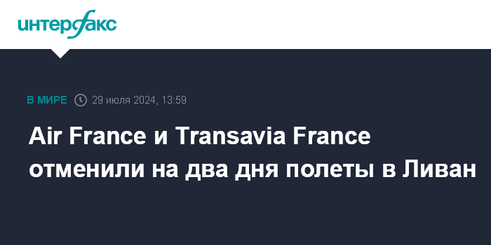 Москва. 29 июля. INTERFAX.RU - Французские авиакомпании Air France и Transavia France отменили полеты в Ливан 29 и 30 июля из соображений безопасности, сообщает BFMTV со ссылкой на пресс-службу группы Air France-KLM.
