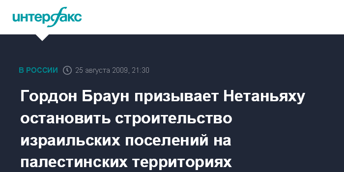 Лондон. 25 августа. INTERFAX.RU - Премьер-министр Великобритании Гордон Браун призвал израильского премьер-министра Биньямина Нетаньяху остановить строительство израильских поселений на палестинских территориях, сообщило во вторник агентство ЭФЭ.