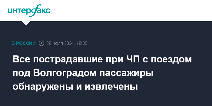 Москва. 29 июля. INTERFAX.RU - Все пострадавшие пассажиры в ДТП с пассажирским поездом под Волгоградом обнаружены и извлечены, сообщила пресс-служба МЧС РФ в понедельник.