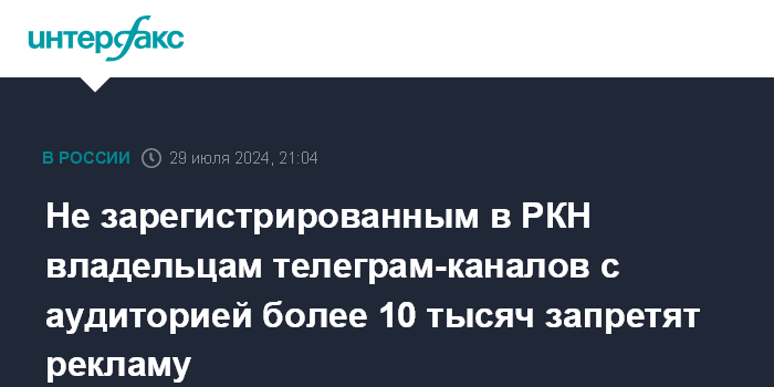 Для не зарегистрированных в перечне РКН каналов "10 тыс.+" устанавливаются следующие запреты: на размещение рекламы; на репост другими каналами их сообщений; на распространение информации о возможных способах финансирования канала и его владельца, пояснил глава комитета.