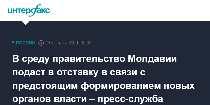 Кишинев. 26 августа. ИНТЕРФАКС. - В среду правительство Молдавии подаст в отставку в связи с предстоящим формированием новых органов власти, сообщили корреспонденту "Интерфакса" источники в пресс-службе молдавского правительства.