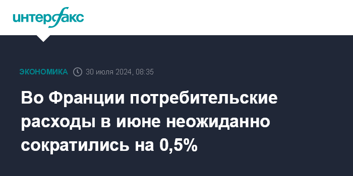 Москва. 30 июля. INTERFAX.RU - Во Франции в июне потребительские расходые сократились на 0,5% к маю, сообщило Национальное статистическое управление Insee.