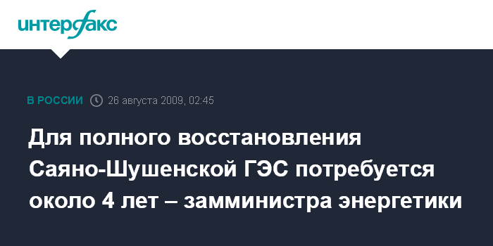 Оценивая сроки возврата СШГЭС к нормальной работе, представитель министерства энергетики сказал: "Для полного восстановления работы станции потребуется около 4 лет".