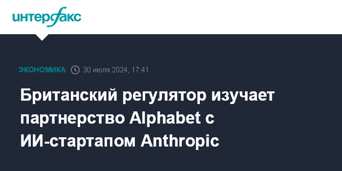 Москва. 30 июля. INTERFAX.RU - Британское Управление по защите конкуренции и рынкам (Competition and Markets Authority, CMA) начало антимонопольную проверку партнерства Alphabet Inc. c американским ИИ-стартапом Anthropic, говорится в сообщении регулятора.